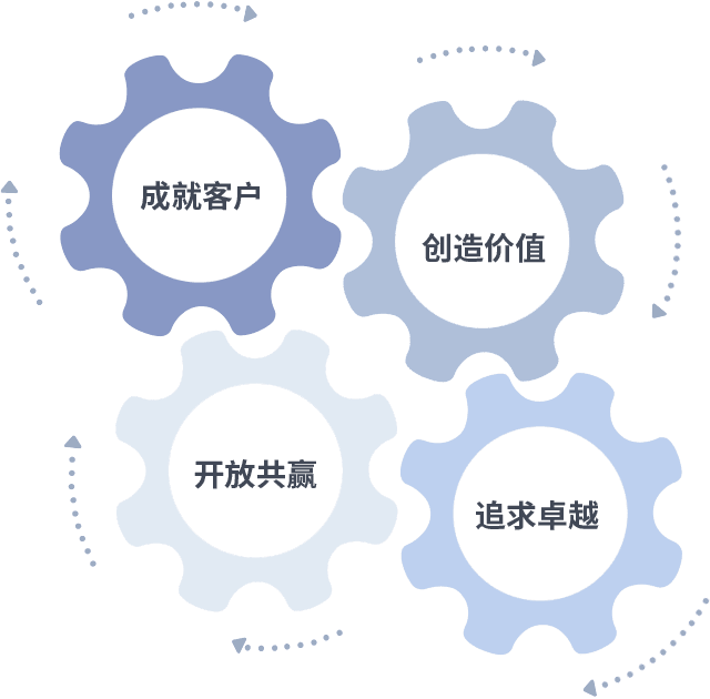 成就客户是一切决策的出发点,,,,创造价值是衡量所有工作的标准,,,追求卓越是我们做事做人的态度,,,,开放共赢是我们的格局也是最终的结果。。。。价值观的齿轮环环相扣,,推动着组织里的每个人不断向前。。。
