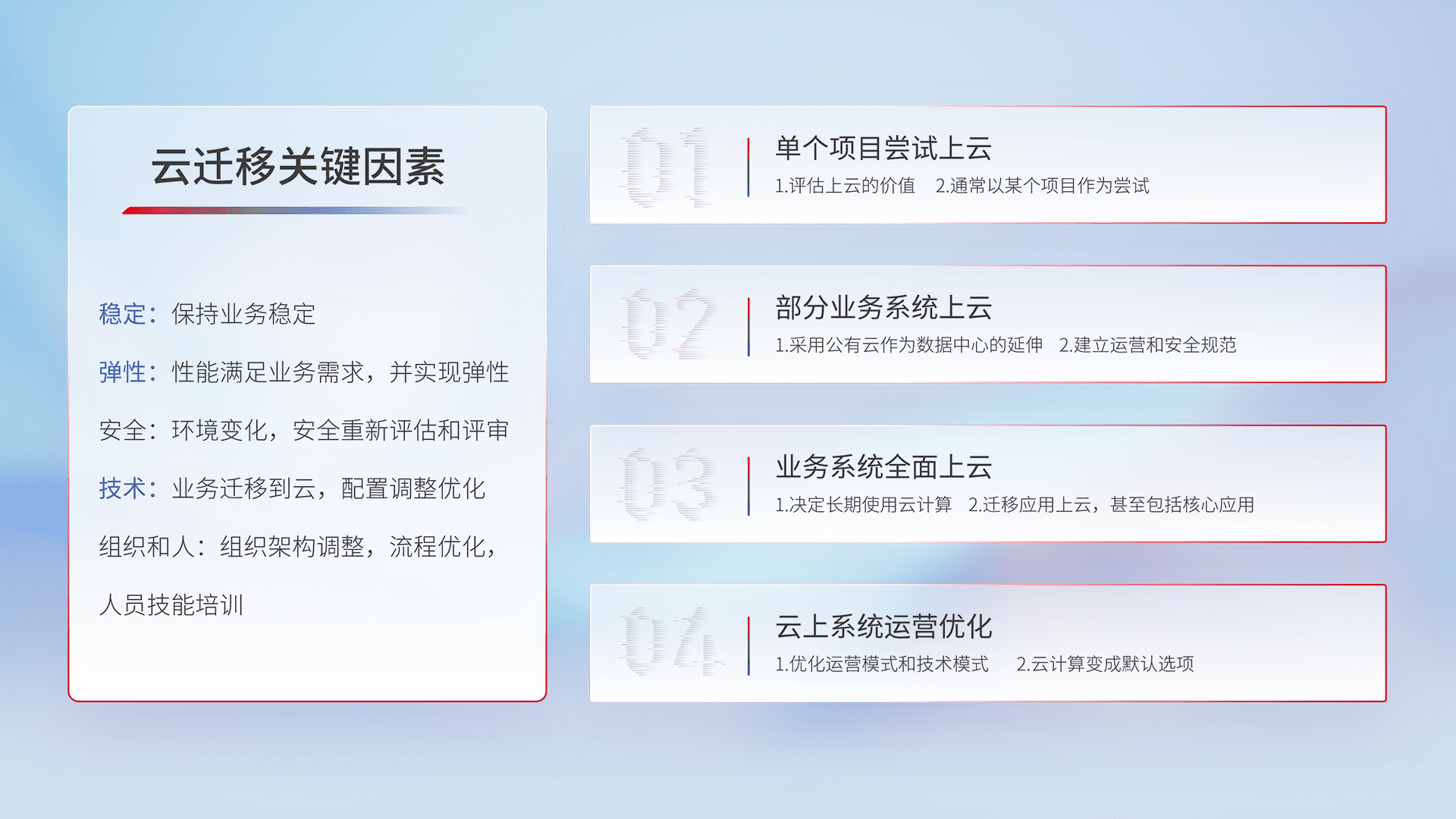 结合实际业务,,从规划设计、、、、云平台选型、、、、云原生改造、、、数据迁移、、、、集成交付,,,,迁移全过程为客户识别最佳上云路径,,做好风险识别管理,,设计网络架构、、、、身份权限、、、、安全审计合规、、、操作审计、、、日志审计、、、监控告警策略、、多站点容灾设计等,,对云上基础设施进行整体规划,,提升IT治理水平,,以满足弹性、、、高可用、、高性能的需求。。