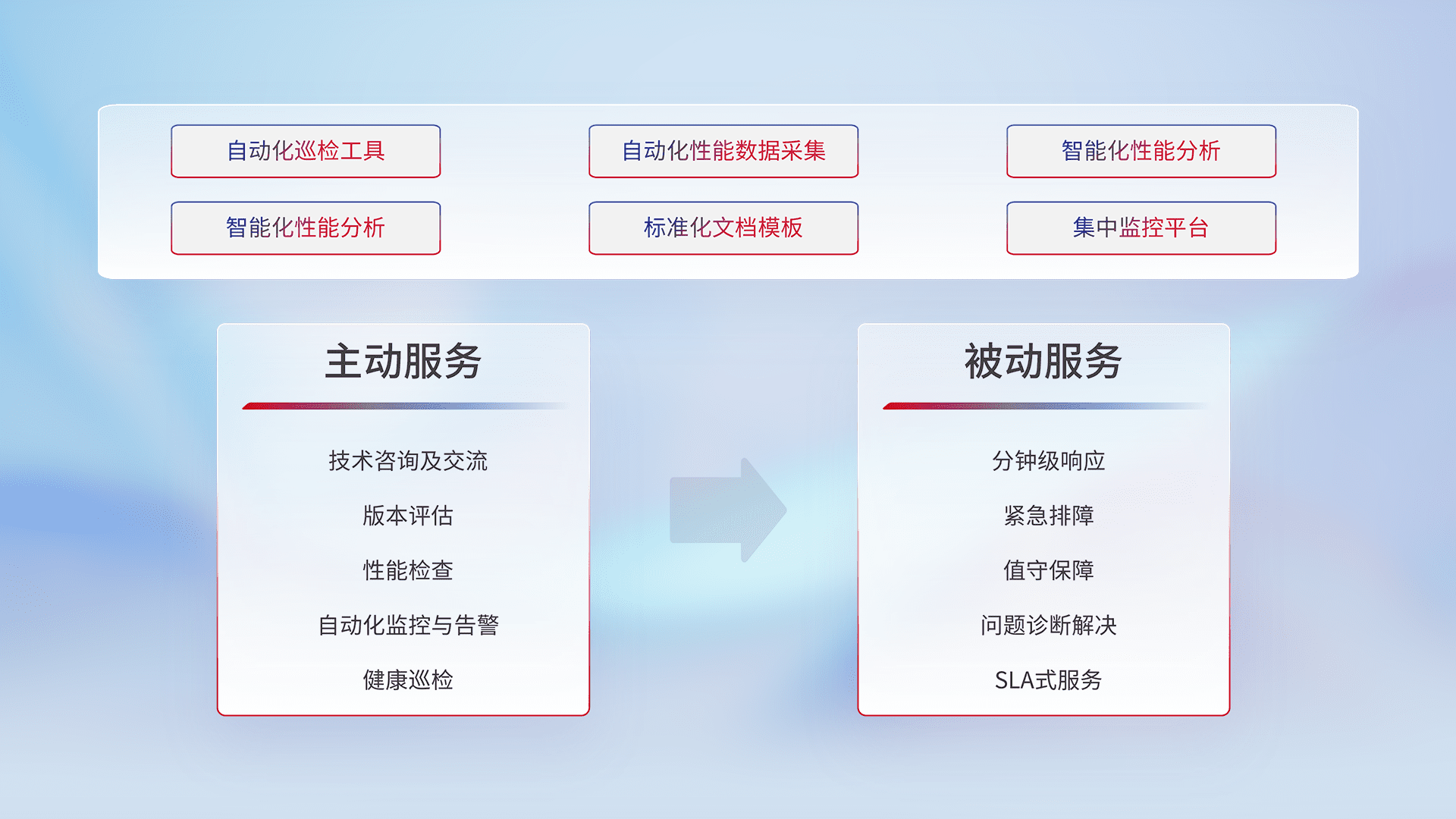 智能化工具和标准化文档,,保障服务质量,,,,提供主动服务(包含技术咨询、、版本评估、、、性能检查、、、自动化监控与告警、、健康巡检)和被动服务包含(分钟级响应、、紧急排障、、值守保障、、问题诊断解决、、、SLA服务)。。。